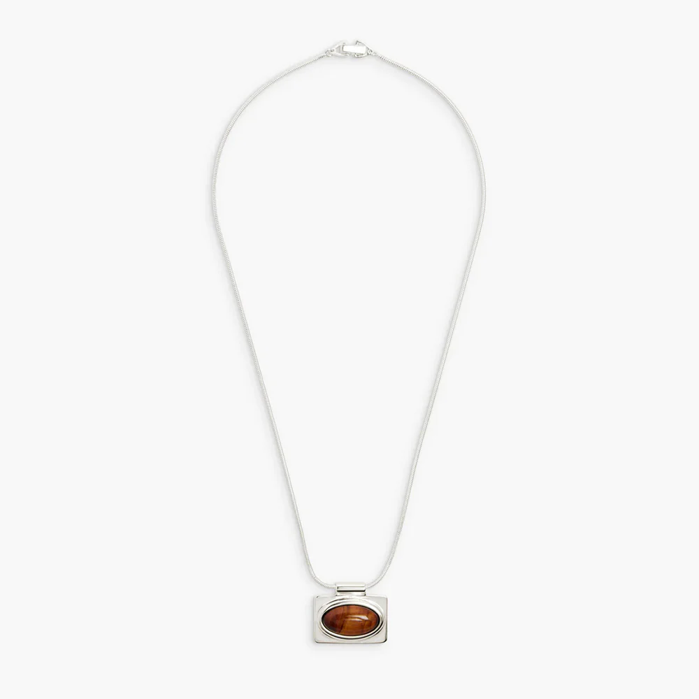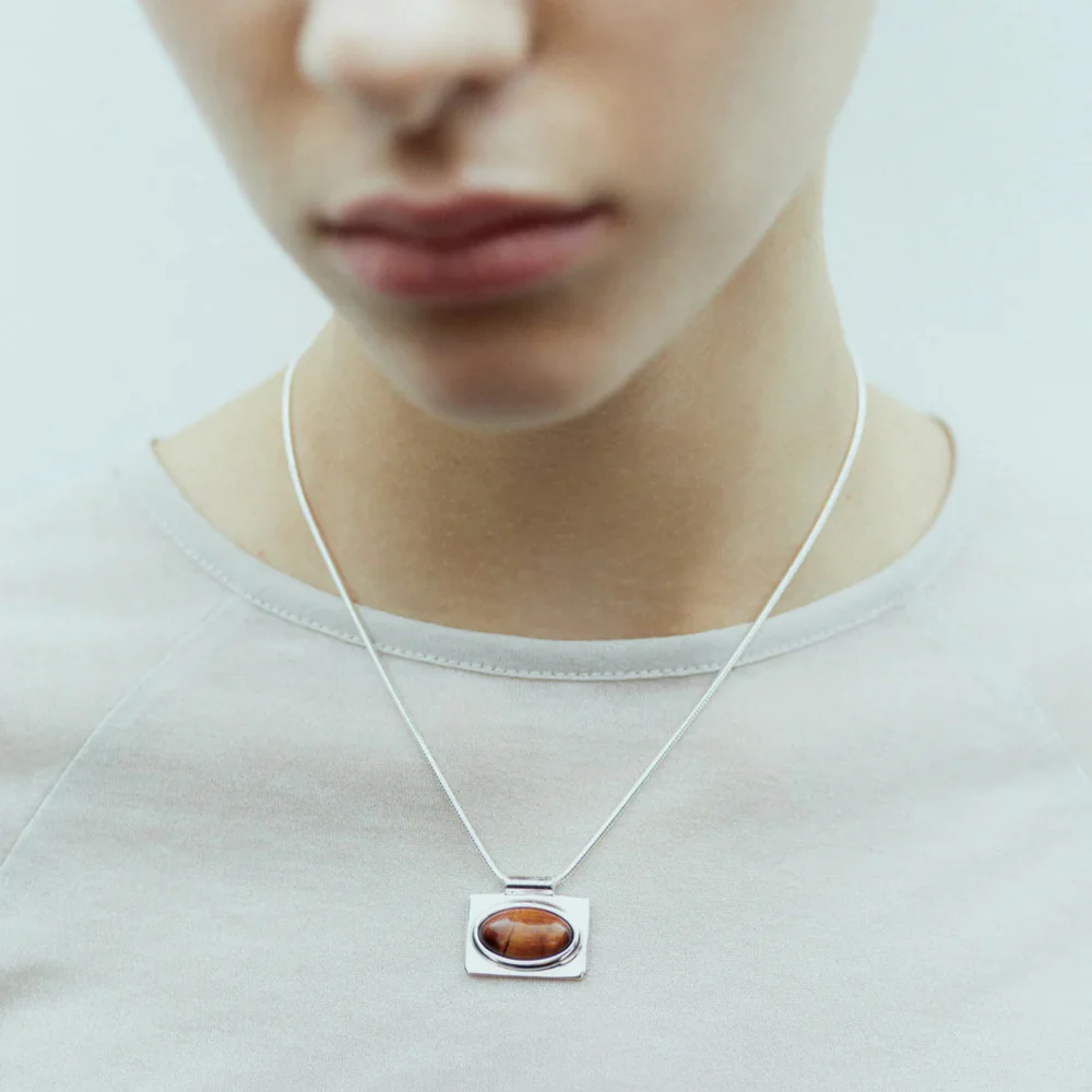 - Un élégant collier à chaîne serpent orné d’un pendentif unique orné d’une pierre ovale en Å“il de tigre rouge, sur un fond carré arrondi et un bord tubulaire moderne.