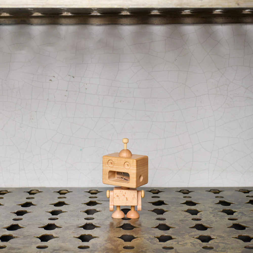 Taille-crayon en forme de robot Conçu à la main Matériau : Hêtre Dimensions : longueur : 5 cm, largeur : 3,5 cm, hauteur : 10 cm